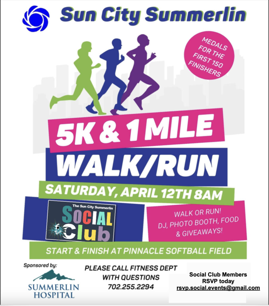 All those representing the Social Club at the Sun City Summerlin 5k & 1 Mile Run / Walk on Saturday April 12th — you’ll get notified as soon as the “swag bag” is available and we’ll coordinate getting that to you. Even if you already signed up with SCSCAI Fitness Department, you can still be on the Social Club team!