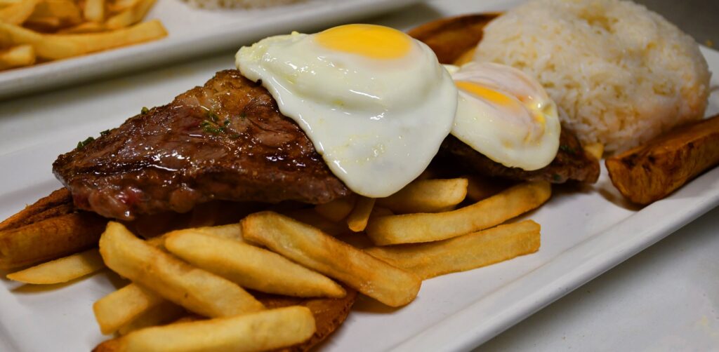 – “A Lo Pobre” translates to “in the poor man’s style,” and includes a protein served with French fries, plantains, and a fried egg.